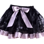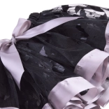 Fekete hálós szoknya dekoratív mintákkal, lila szegéllyel és masnival. A rugalmas derék kényelmes viseletet és könnyű felvételt biztosít.