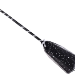Összecsukható seprű fekete-fehér spirálmintával és díszes rojtokkal, amely játékos lendületet ad a jelmeznek.