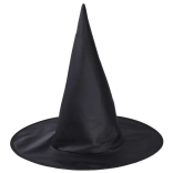 Hagyományos fekete boszorkánykalap magas csúccsal és széles karimával az autentikus jelmezért.