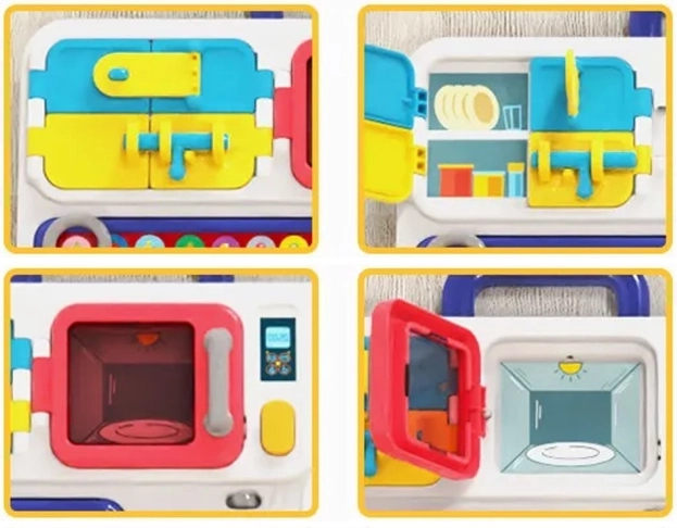 A készlet tartalmaz mikrohullámú sütőt, tűzhelyet és más konyhai elemeket olyan funkciókkal, amelyek valósághű főzőhangokat és -hatásokat szimulálnak.