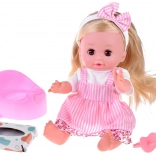 A baba gyönyörű fehér és rózsaszín virágmintás ruhában és fehér pólóban van. Pisilő funkcióval van felszerelve, ami lehetővé teszi a gyerekeknek, hogy megtanulják a babaápolást. Valósághű érzést nyújt a kemény gumiból készült fej, karok és lábak által.