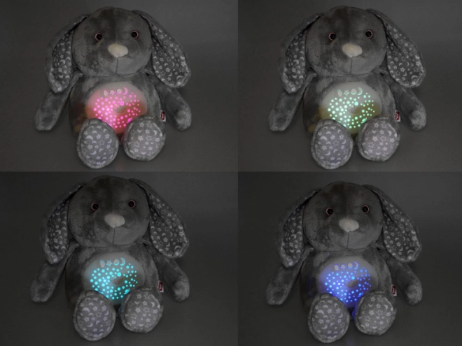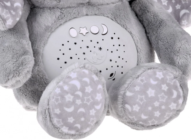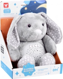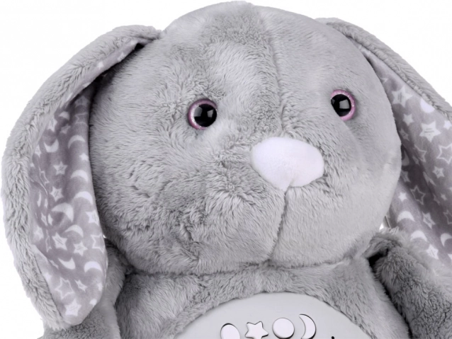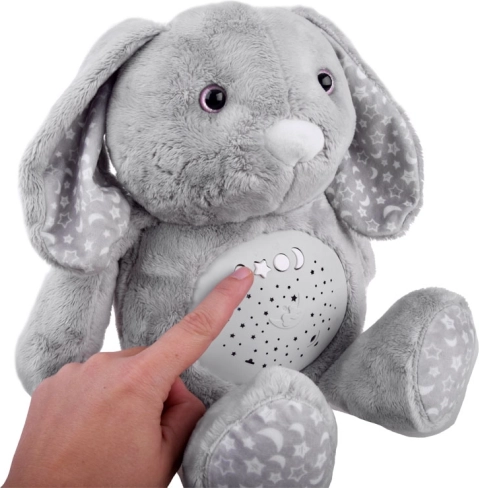 Ez a puha plüss nyuszi finom anyagból készült, tompa szürke színben, csillag- és holdmintákkal díszített fülön és lábakon. Szemei műanyagból készültek, míg az orra hímzett, ami aranyos megjelenést kölcsönöz a játéknak. Az interaktív panelnek köszönhetően, amely a nyuszi hasában található, az alvási nehézségekkel küzdő gyermekek elengedhetetlen társává válik.