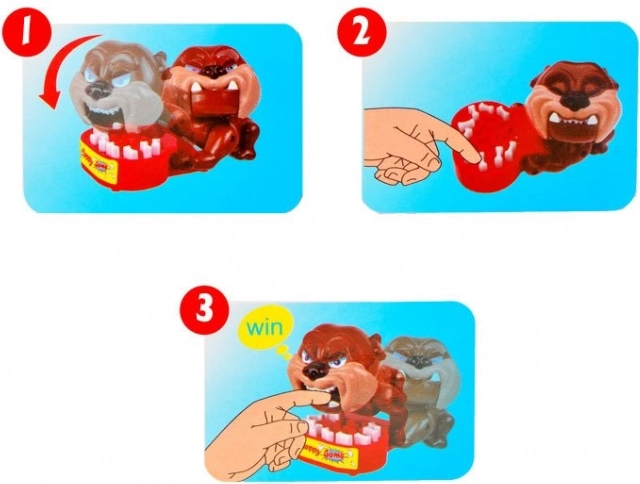 - Játékszabályok: Óvatosan nyomd meg a tálban lévő fogakat. Ha a rossz fogat nyomod meg, a kutya megpróbálja megvédeni az ételét és megharap. Ha megharap, kiestél a játékból.