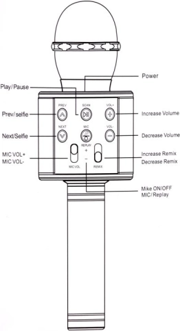 - PREV, NEXT, szünet/lejátszás (SCAN), REC/hangmoduláció, VOL +/-, MIC VOL, REMIX/ECHO