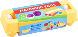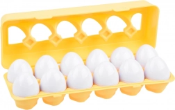 Ez az okos készlet 12 fehér tojást tartalmaz sárga műanyag tartóban. Belül színes felek és formák találhatók, amelyeket helyesen kell párosítani szín és forma szerint (pl. csillag, szív, kör, négyzet és más alakzatok). A játék támogatja a korai készségfejlődést, türelemre és összpontosításra tanít.