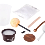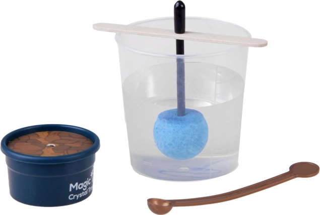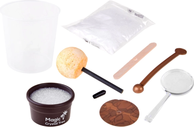 A szett mindent tartalmaz: 200 ml-es mérőhengert, tasakot kristályporral/homokkal, színes kristálymagot pálcikán, keverőpálcát, nagyítót a részletes megfigyeléshez, fa lapocskát, ütközőt és egy kis virágcserepet (talapzat). Az eljárás egyszerű és biztonságos: elég az útmutatót követni, és a forró vízzel felnőtt felügyelete mellett dolgozni.