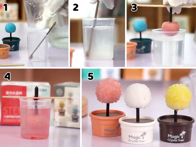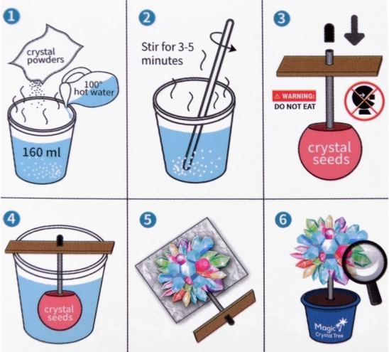 - Gyors kezdés: keverd el a kristályport forró vízben, helyezd be a magot, és figyeld a növekedést.