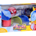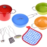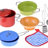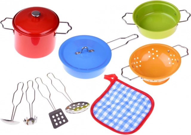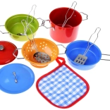 Színes fém szett kis szakácsoknak, amely élethű főzős játékot kínál. Tartalmaz lábasokat, serpenyőt, szűrőt és eszközöket, ideális a fantázia, a finommotorika és a szerepjáték fejlesztéséhez a gyerek konyhában.