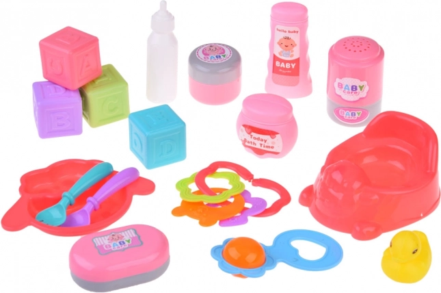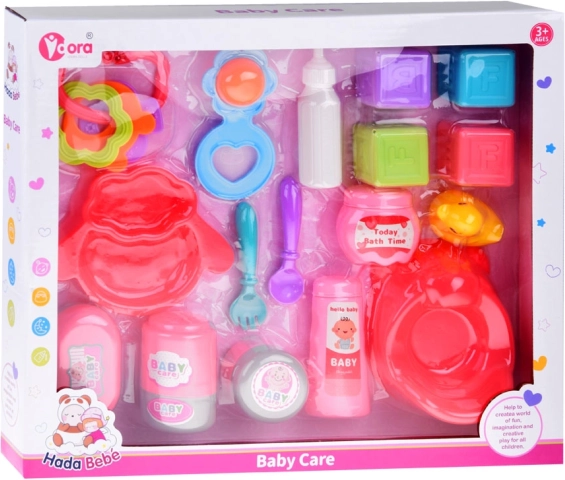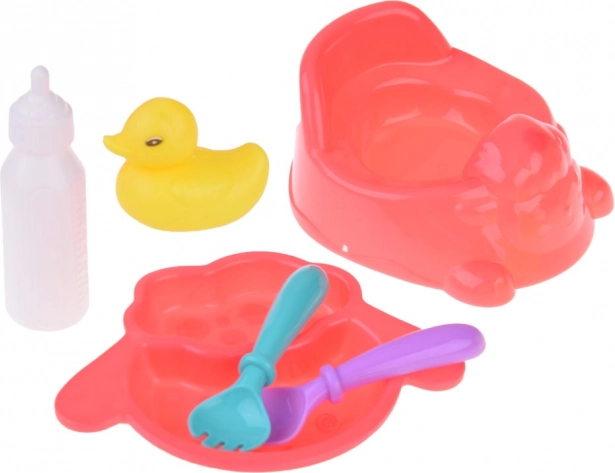 Ez a játék szett minden szükséges elemet tartalmaz, amire egy kis anyukának szüksége van babája gondoskodásához. Tartalmaz alapvető eszközöket a szerepjátékhoz, mint a bili, tányér kanállal és villával, valamint különféle üvegcsék és kiskacsa a fürdéshez. A rekvizitek mindegyike a gyerekek képzeletének és motorikus készségeinek fejlesztésére lett tervezve.