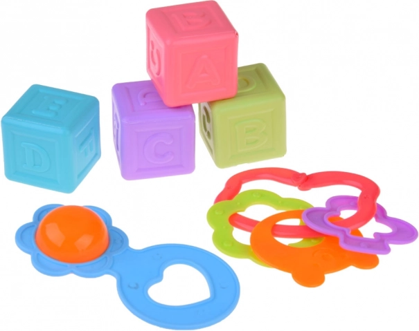 A szett elemei segítenek a finommotorika fejlesztésében és a szem-kéz koordinációban, mint például a színes kiskacsák és különféle építőjátékok.