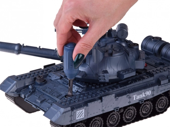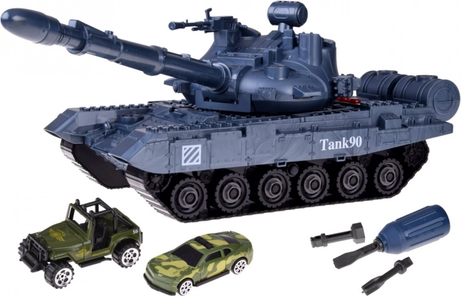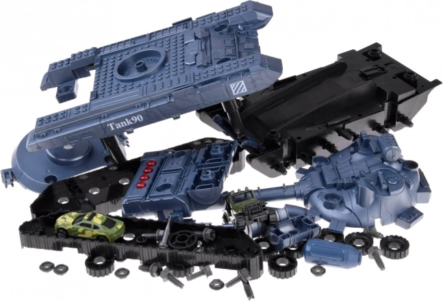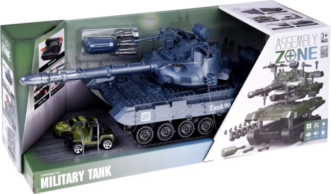 A készlet tartalmazza a tank összeszereléséhez szükséges alkatrészeket, csavarhúzót három fejjel és két katonai járművet. Kiváló kihívás a kis szerelők számára.