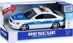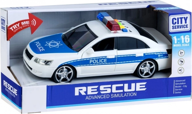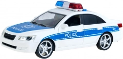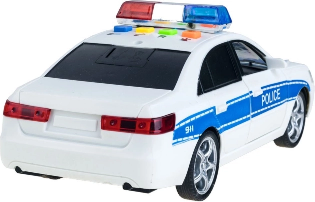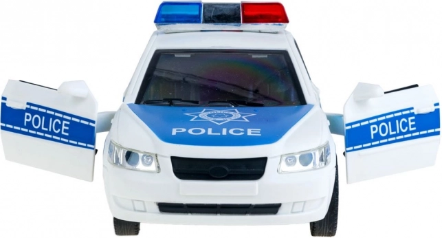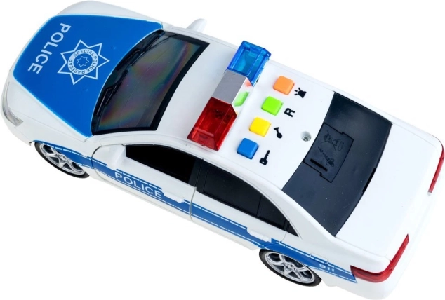 Valósághű rendőrautó részletekkel, mint például kék és piros fények és 'POLICE' feliratok.
