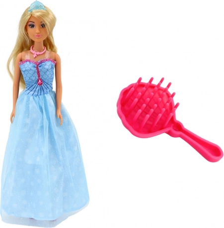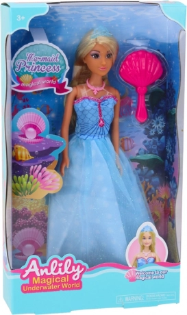 Varázslatos ANLILY sellő hercegnő baba a víz alatti kalandok világába repíti a gyerekeket. Hosszú arany hajjal, elegáns, tengeri motívumos kék ruhával és koronával érkezik. A csomag része egy fésű a hajformázáshoz, amely támogatja a kreatív játékot és a fantázia fejlődését. Ideális 3 éves kortól, CE tanúsítvánnyal és EN71 szabványnak megfelelő kivitelben.