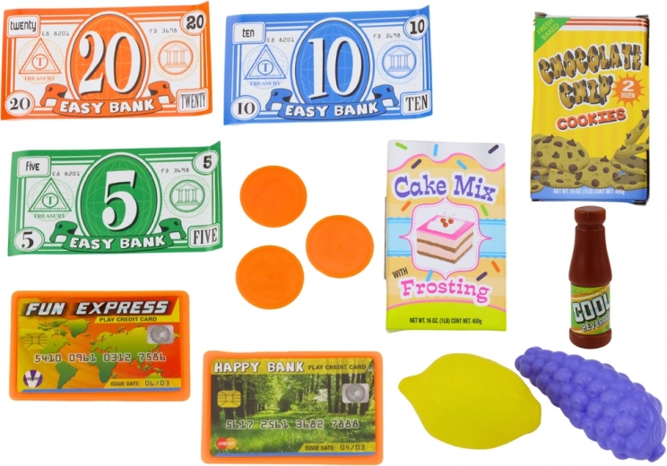 A készlet tartalmaz játékpénzt, bankjegyeket, érméket és bankkártyákat is, amely kiváló lehetőség a pénzszámolási készségek és interperszonális képességek fejlesztésére az értékesítési interakciók szimulálásán keresztül.