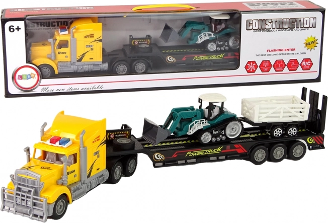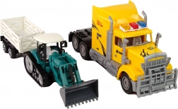 kamion R/C távirányítóval, pótkocsi, lánctalpas markoló, utánfutó, töltő, ablakos ajándékcsomagolás