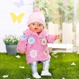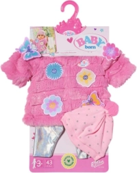 Melegítsd fel a babádat a bájos BABY born szettel, 43 cm-es babákhoz. A készlet puha, rózsaszín csillogó műszőrmés kabátkát, fémes fényű leggingset és pomponos sapkát tartalmaz. A díszes virág- és pillangóapplikációk varázst és stílust kölcsönöznek az öltözéknek, miközben a minőségi anyagok kényelmes öltöztetést és hosszan tartó használatot biztosítanak a mindennapi játék során.