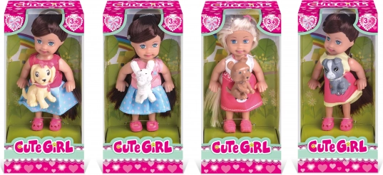 Aranyos bábu kutyussal, 11 cm. Ideális utazáshoz, 12 db-os csomagban, négy változatban. Tökéletes gyermekjátékokhoz.