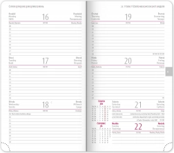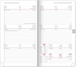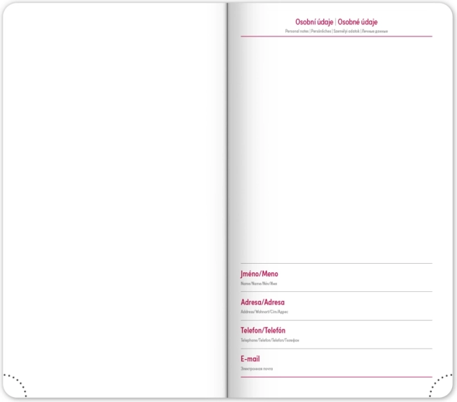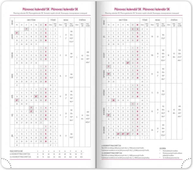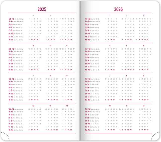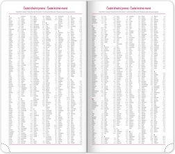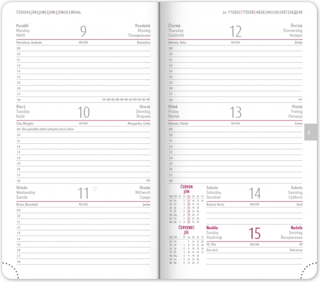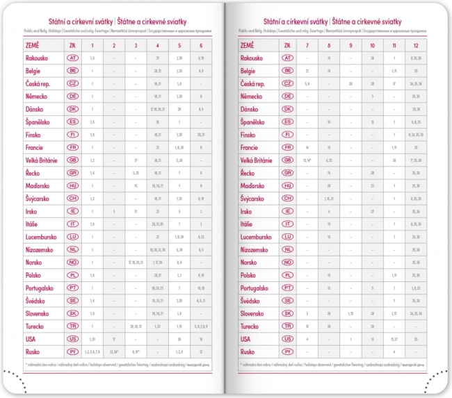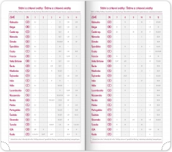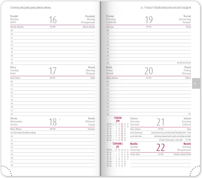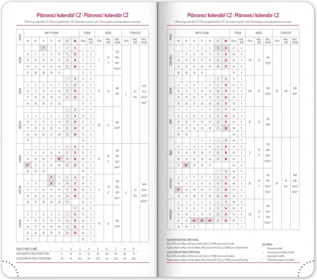 A naptár áttekinthető heti elrendezést kínál cseh–szlovák naptárral és kiegészítő angol, német, magyar és orosz nyelvvel. Nem hiányoznak a havi és éves tervező naptárak, az ünnepnapok áttekintése, a bővített cseh névjegyzék és a térképek sem. A lekerekített sarkok, a textil könyvjelző és a perforált sarkok megkönnyítik a mindennapi használatot, a évszám és logó prégelésének lehetősége pedig a cégek és az igényes felhasználók számára is vonzó.