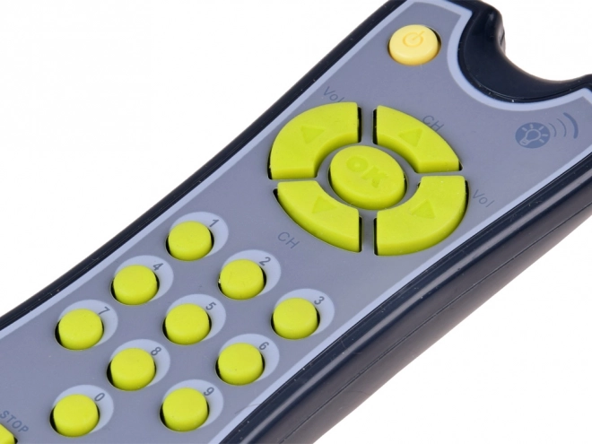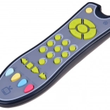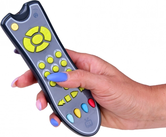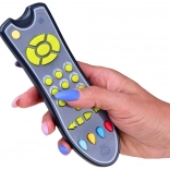 Úgy néz ki, mint egy valódi TV távirányító, de gyerekekre szabva – tartós műanyag, puha gombok és kényelmes méret a kis kezekhez.