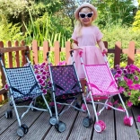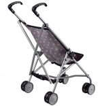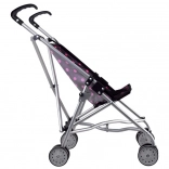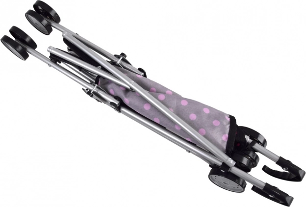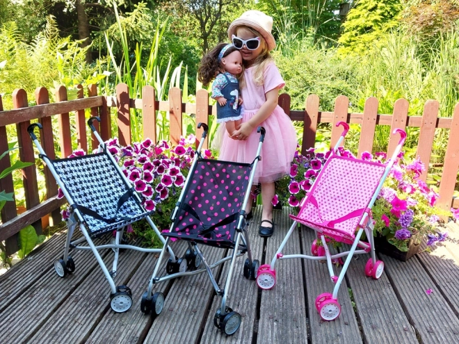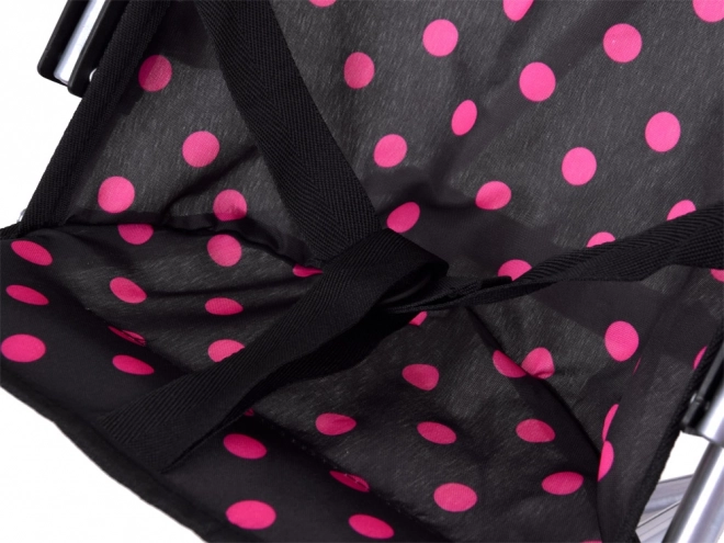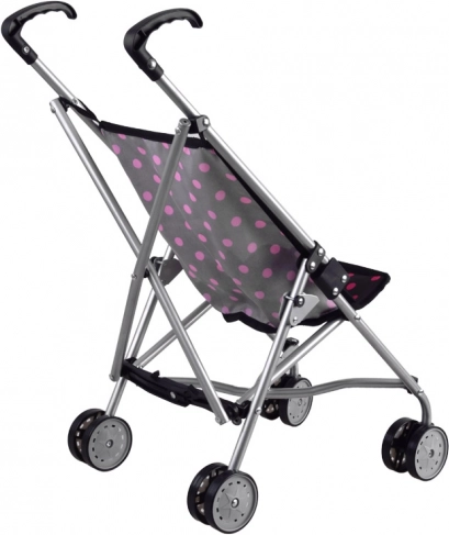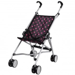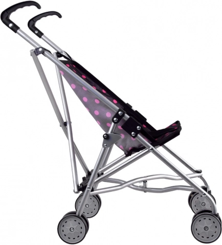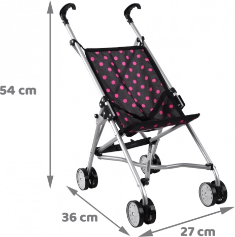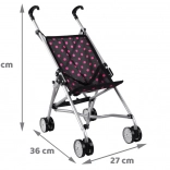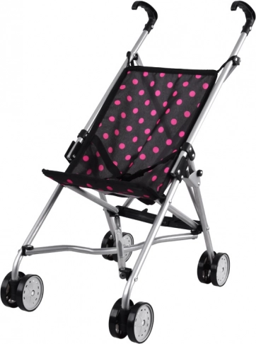 Könnyű és kompakt babakocsi fekete színben, rózsaszín pöttyökkel, amely minden gyermeket megörvendeztet. A masszív fém váz, a kényelmes fogantyúk és a kettős kerekek az egyenletes gurulásért révén könnyen irányítható és biztonságos a mindennapi játékhoz.