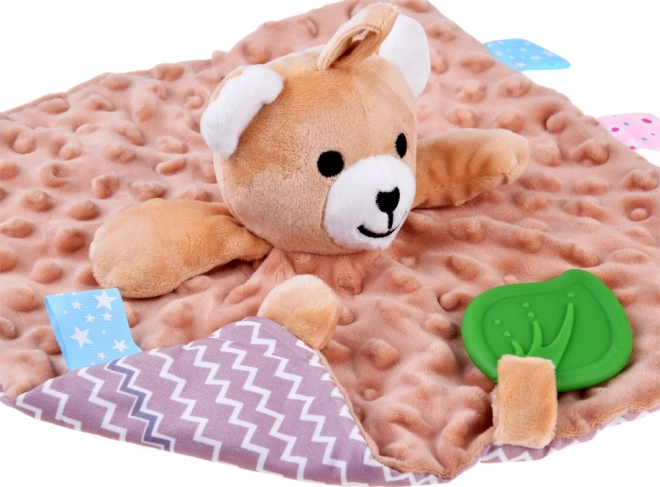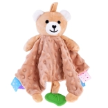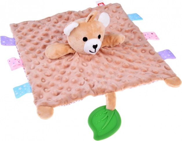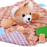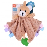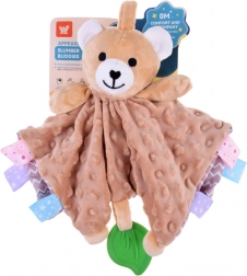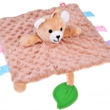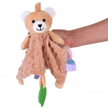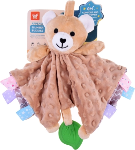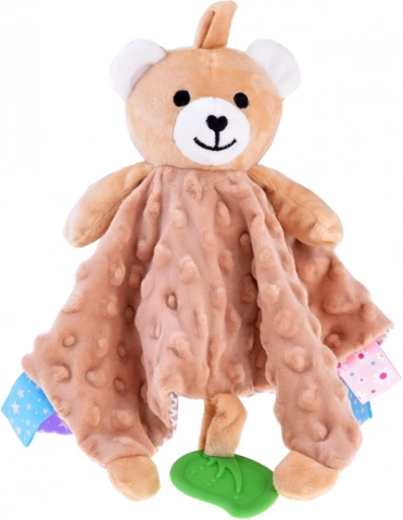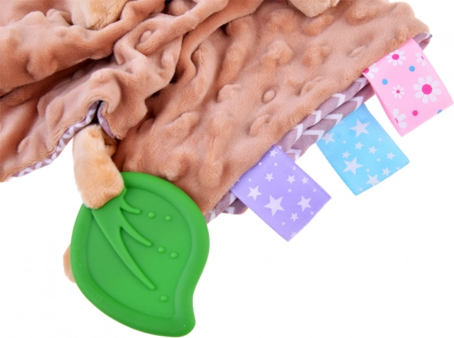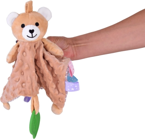 Ez a pihe-puha alvótárs a takaró-megnyugtató komfortját és a szenzoros játék élményét ötvözi. A gyermeket változatos textúrák, sustorgó és csipogó elemek, valamint a széleken található színes címkék vonzzák, amelyek tapintásra, gyömöszölésre és húzogatásra ösztönöznek. A zöld szilikon levél rágókaként szolgál, és segít masszírozni az érzékeny ínyt a fogzás során.