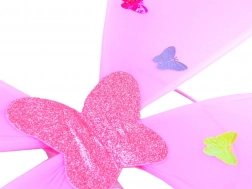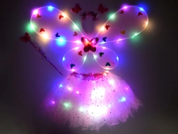 Ez a finom tündérjelmez világos rózsaszín kivitelével és játékos pillangódíszeivel tűnik ki. A rugalmas derekú tüll, csillámporos szoknya apró csillogással van megszórva, a szárnyakat színes pillangók ékesítik, a hatást pedig LED fények teszik teljessé, amelyek félhomályban is gyönyörű látványt nyújtanak.