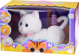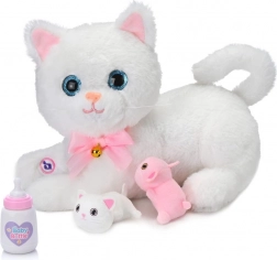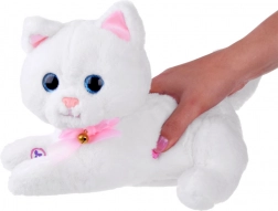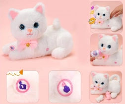 Az interaktív fehér cica tökéletes társ a kis állatbarátoknak. Nagy kék szemei vannak, rózsaszín masnival és csengővel, valamint selymes plüsse, amely ölelgetésre hív. A pocakjában két apró kiscicát rejt, a csomagban pedig egy rózsaszín cumisüveg is található a játékos etetéshez.
