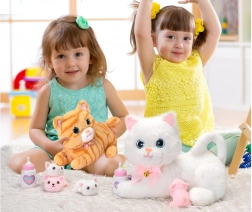 Aranyos, interaktív cica két kiscicával és cumisüveggel, amely órákon át tartó szórakozást és megnyugtató ölelést kínál. Az olyan funkcióknak köszönhetően, mint a felvétel és lejátszás, a nyávogás és dorombolás, a melódiák és dalok, valamint a simogatásra és etetésre adott reakciók, a gyerekek megtanulnak gondoskodni és fejlesztik a fantáziájukat. A kiscicák az anyacica pocakjában vannak elrejtve, a játék pedig puha, kellemes plüssből készült.