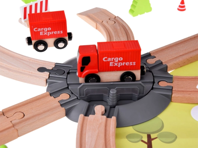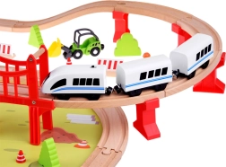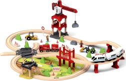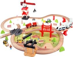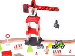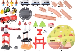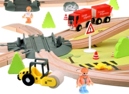 E készlet különlegessége a funkcionális daru és elektromos vonat, amely lehetővé teszi az előre és hátrafele haladást. A csomag figurákat, közlekedési táblákat, bokrokat, valamint hidak és más szerkezetek építőelemeit is tartalmazza. A legtöbb részlet precízen kialakított, biztonságosan festett faanyagból készült, gyönyörű természetes árnyalatokkal.