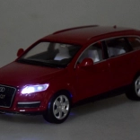 Játék Audi Q7 SUV városi közlekedésre tervezett kisautó. Az autó nagyon gondosan és esztétikusan készült, a legkisebb részletekre is odafigyelve, ami minden kis sofőrt biztosan megörvendeztet. Hang- és fényhatásokkal rendelkezik, nyitható ajtókkal, csomagtartóval és motorháztetővel. Az autó sima felületen hátrahúzós mechanizmussal (Friction power) mozog.