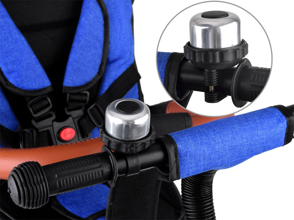 - forgatható ülés, ötpontos öv, védőkorlát, összecsukható hálós napellenző, lábtartók, pedálok, csengő, 2 kosár, szülői táska