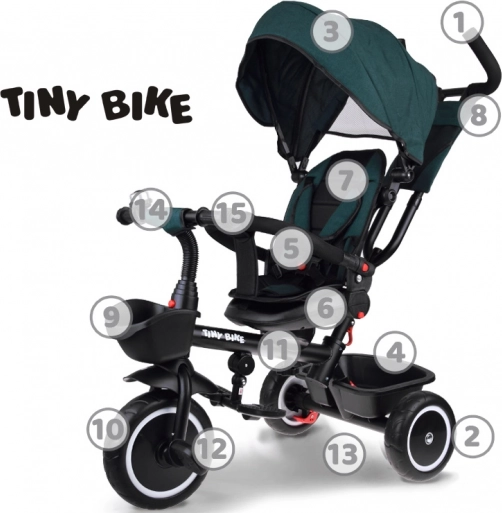 A praktikus 3 az 1-ben TINY BIKE gyerek tricikli együtt nő a gyermekkel 6 hónapostól 5 éves korig. Kínál forgatható ülést, összecsukható napellenzőt szellőzéssel, 5 pontos biztonsági övet, hátsó kerékfékeket és szülői kormányzást állítható tolókarral. A belső nélküli EVA kerekek, a masszív acél váz és a gazdag felszereltség kényelmet és biztonságot nyújt minden sétán.