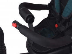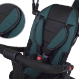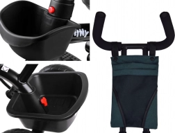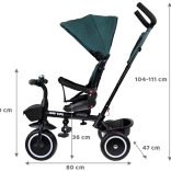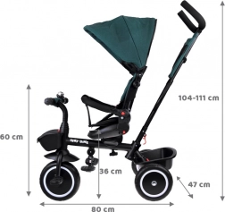 Az összekapcsolt kormányzás állítható tolókarral teljes kontrollt ad a felnőttnek. A hátsó dupla fékek stabilan rögzítik a triciklit megálláskor.