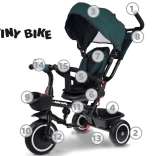 A praktikus 3 az 1-ben TINY BIKE gyerek tricikli együtt nő a gyermekkel 6 hónapostól 5 éves korig. Kínál forgatható ülést, összecsukható napellenzőt szellőzéssel, 5 pontos biztonsági övet, hátsó kerékfékeket és szülői kormányzást állítható tolókarral. A belső nélküli EVA kerekek, a masszív acél váz és a gazdag felszereltség kényelmet és biztonságot nyújt minden sétán.