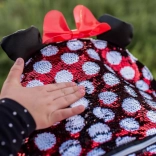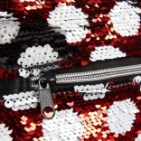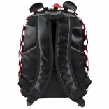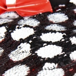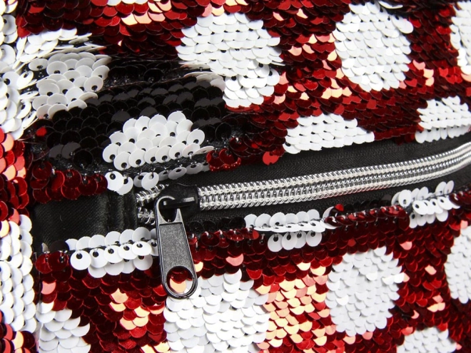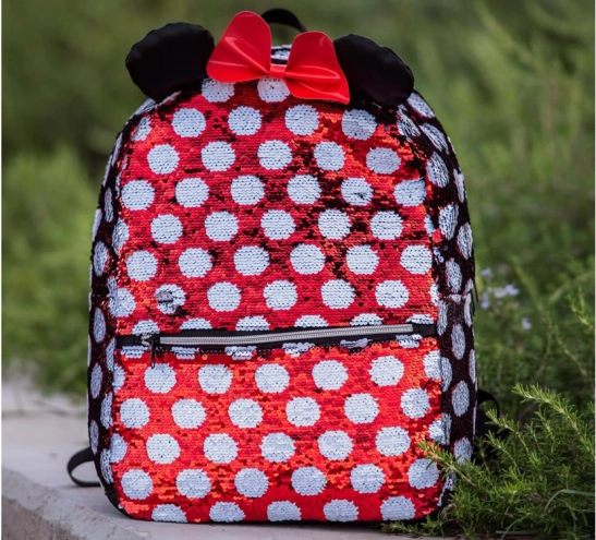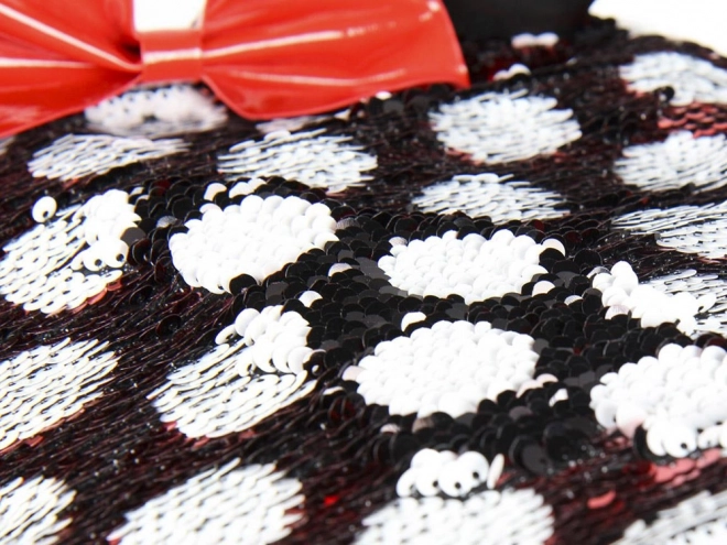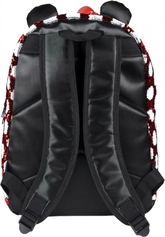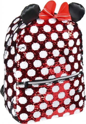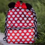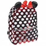 A vörös-fehér pöttyös Minnie mintás hátizsák piros masnival és csillogó fülekkel igazán varázslatos.
