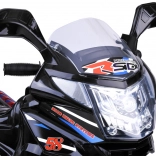 Ez az akkumulátoros gyermekmotor sportos vonalaival és gazdag LED megvilágításával örömet szerez a gyors gépek kis rajongóinak. Kompakt méreteinek köszönhetően beltérre és az udvaron vagy a teraszon lévő szilárd burkolatra egyaránt megfelelő. A kerekeken lévő puha gumicsík csillapítja a rezgéseket és csökkenti a zajt.