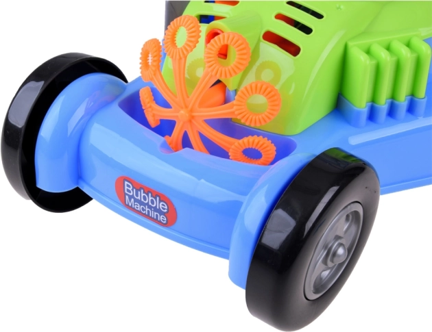 Öntsd az oldatot a tartályba, majd nyomd meg a piros gombot – a fűnyíró tologatás közben rengeteg csillogó buborékot képez.