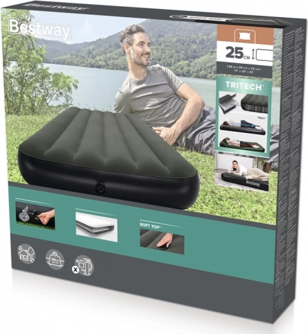 A BESTWAY Tritech Twin felfújható matrac megbízható kényelmet nyújt egy fő számára, akár vendégeket szállásol el, a szabadban alszik, vagy gyors ideiglenes fekhelyre van szüksége. A TRITECH anyagból készült többrétegű falak növelik a behajlással szembeni ellenállást és egész éjjel biztosítják az alakstabilitást, míg az I‑beam belső szerkezet szilárdságot és stabilitást ad. A kellemes, puha vinil felület fokozza az alvás kényelmét.
