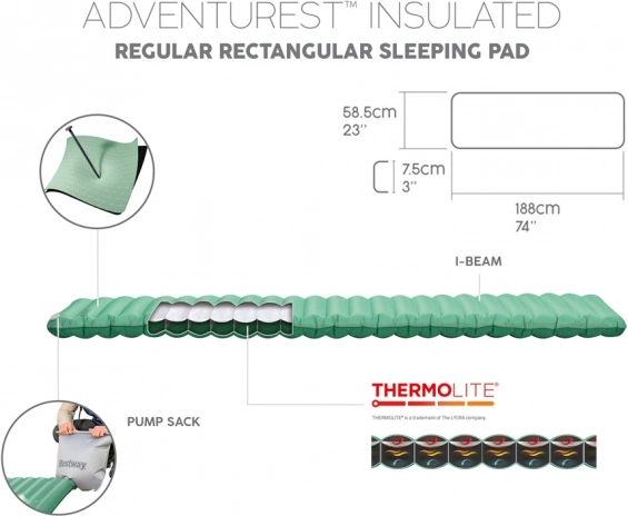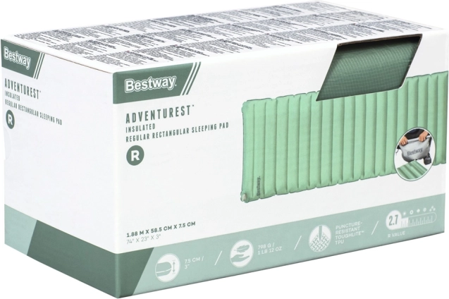 A Bestway AdventuRest felfújható hálómatrac a kényelmet és a funkcionalitást ötvözi, így tökéletes választás szabadtéri éjszakázásokhoz. Strapabíró ToughLite anyagból, ripstop szövetből készül, amely véd a sérülésekkel szemben. Emellett ThermoLite szigetelő réteget is tartalmaz, amely könnyűséget és meleget biztosít.