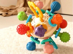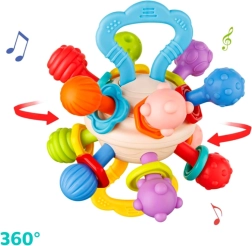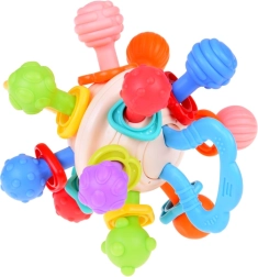 A baba rágóka segít stimulálni a gyermek érzékszerveit a textúrák és kiemelkedések változatossága révén, ösztönözve a felfedezésre és az új tapintási érzékek felfedezésére. A kerek forma és a puha anyag enyhítést nyújt a fogak növekedése során, csökkenti a kényelmetlenséget és az íny fájdalmát. A gyermek könnyen megfoghatja és kezelheti a rágókát, ami támogatja a finommotorika és a kéz-szem koordináció fejlődését. A rágóka biztonságos anyagokból készül babák számára, BPA-mentes és más káros anyagoktól mentes, így biztonságos és megbízható termék. A szülőkkel közösen a rágóka nagyszerű interaktív játék lehet, elősegítve az érzelmi kötődést és a gyermek kommunikációs készségét.