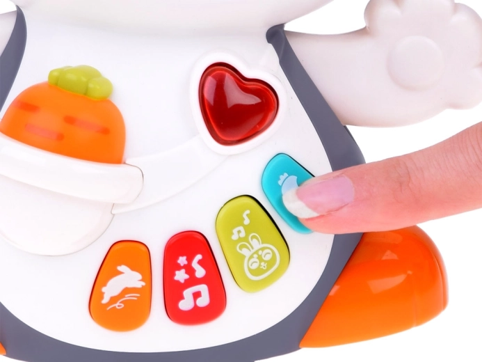 Színes gombok indítanak különféle dallamokat és hangokat (szívdobbanás, ugrálás, répa rágcsálása), amelyeket villogó fények kísérnek – ideális az érzékszervi stimulációhoz.