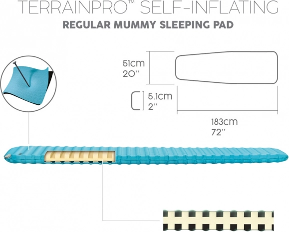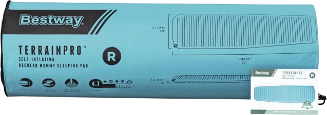 A BESTWAY TerrainPro önfelfújó matrac maximális kényelmet és hőszigetelést kínál kempingezéshez és túrákhoz. A 183 × 51 × 5,1 cm-es méreteknek és az R 4,7-es értéknek köszönhetően hidegebb időben is megtartja a meleget. A strapabíró ToughLite és a 70D ripstop nejlon hosszú élettartamot biztosít, míg az alacsony profilú szelep felgyorsítja a felfújást és a leeresztést. Mindössze 924 g tömeggel és 15 × 54 cm kompakt csomagmérettel könnyen elfér a hátizsákban; nem hiányzik a tárolózsák és a javítófolt sem.