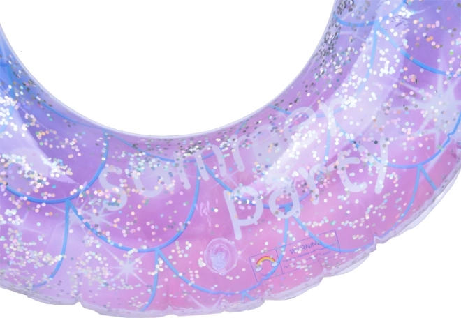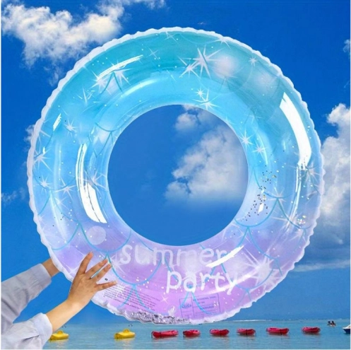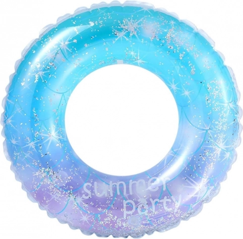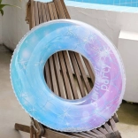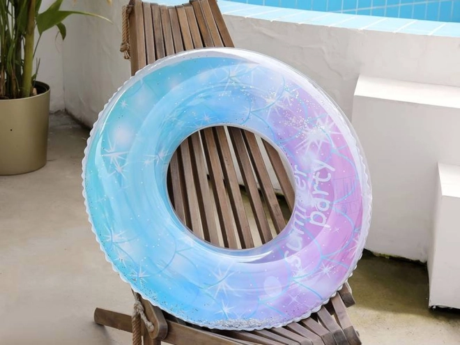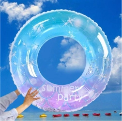 Átlátszó karika kék–rózsaszín átmenettel és „summer party” csillámokkal – ragyog a medencénél és a strandon, és örömet okoz minden gyereknek.