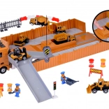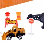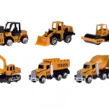 A készlet 6 mini gépet tartalmaz forgó kerekekkel és funkcionális elemekkel – markoló, targonca, betonkeverő, úthenger, rakodó és billencs.