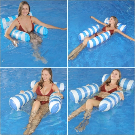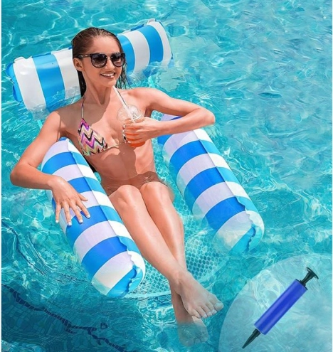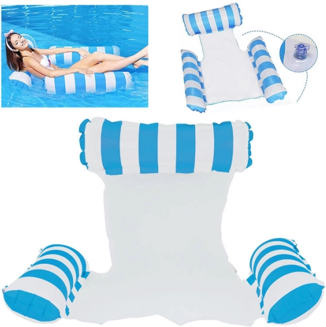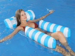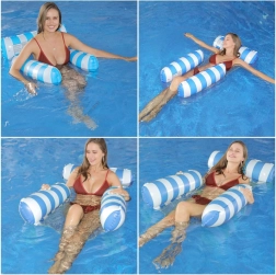 Búcsúzzon az átlagos úszómatracoktól és üdvözölje a különleges megoldást - a függőágy stílusú matracot, amely tökéletes a forró nyári napokra. Részleges vízbe merülést tesz lehetővé, így napozás közben mindig kellemes hűvösben lesz. A matrac tartós PVC-ből készült felfújható részekkel és nylon hálóval van összekapcsolva a maximális kényelem érdekében. Elegáns kék-fehér dizájnja pedig a nyaralási fotóinak éke lesz.