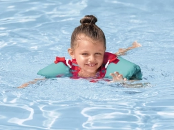A mellény olyan anyagokból készült, amelyek kellemesek a gyermek bőrének, és kényelmet biztosítanak úszás közben.
