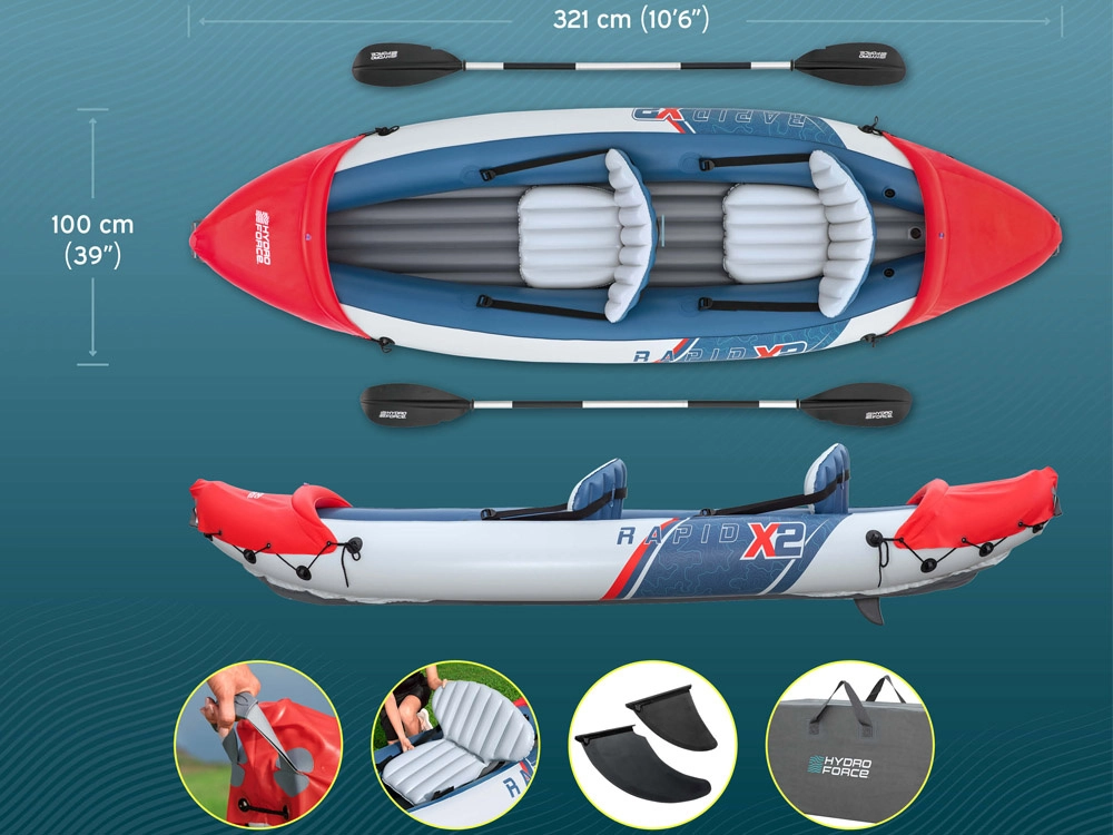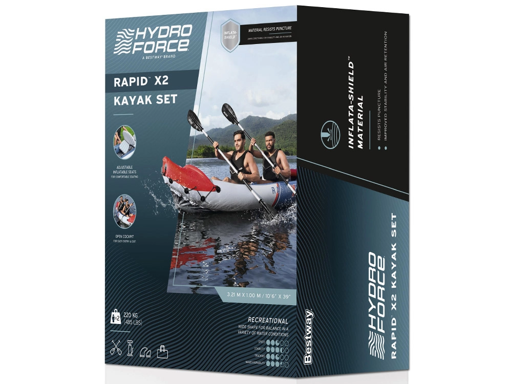 - Teherbírás akár 160 kg, felfújt méret 321 × 88 cm a kényelmes páros evezéshez