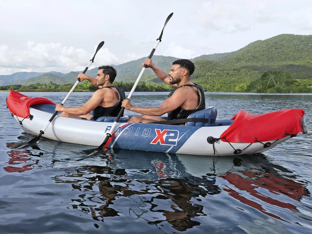 Élvezd a nyugodt tavakat, öblöket és lassabb folyókat ezzel a tandem kajakkal, amely a strapabíró, 0,57 mm vastag PVC szerkezetet kivételes praktikummal ötvözi. A gyors csavaros/Boston szelepeknek köszönhetően könnyű a felfújás és leeresztés, míg a puha I‑beam padló merevséget és kényelmet ad evezés közben.