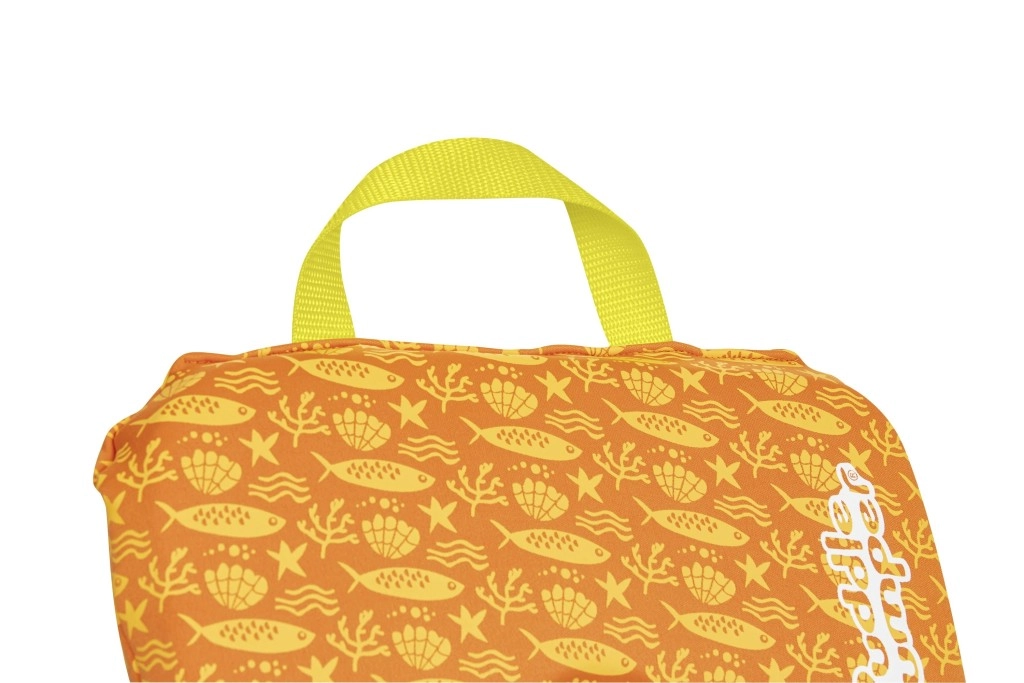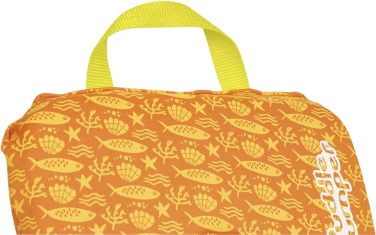- Kiváló láthatóság: élénk narancs–sárga színek és vidám tengeri motívumok