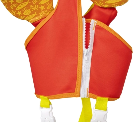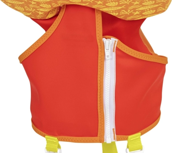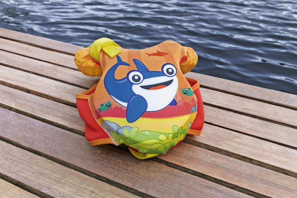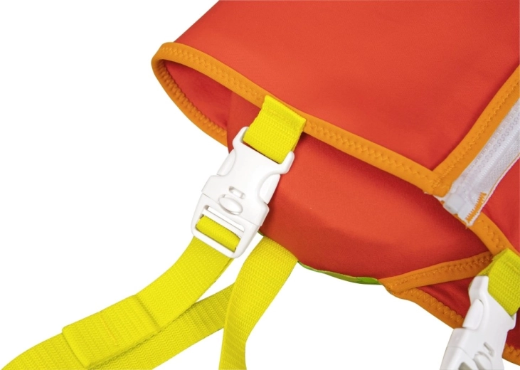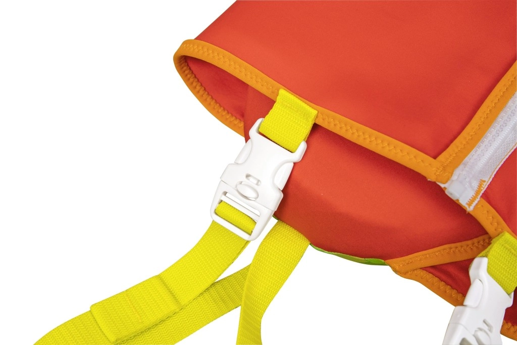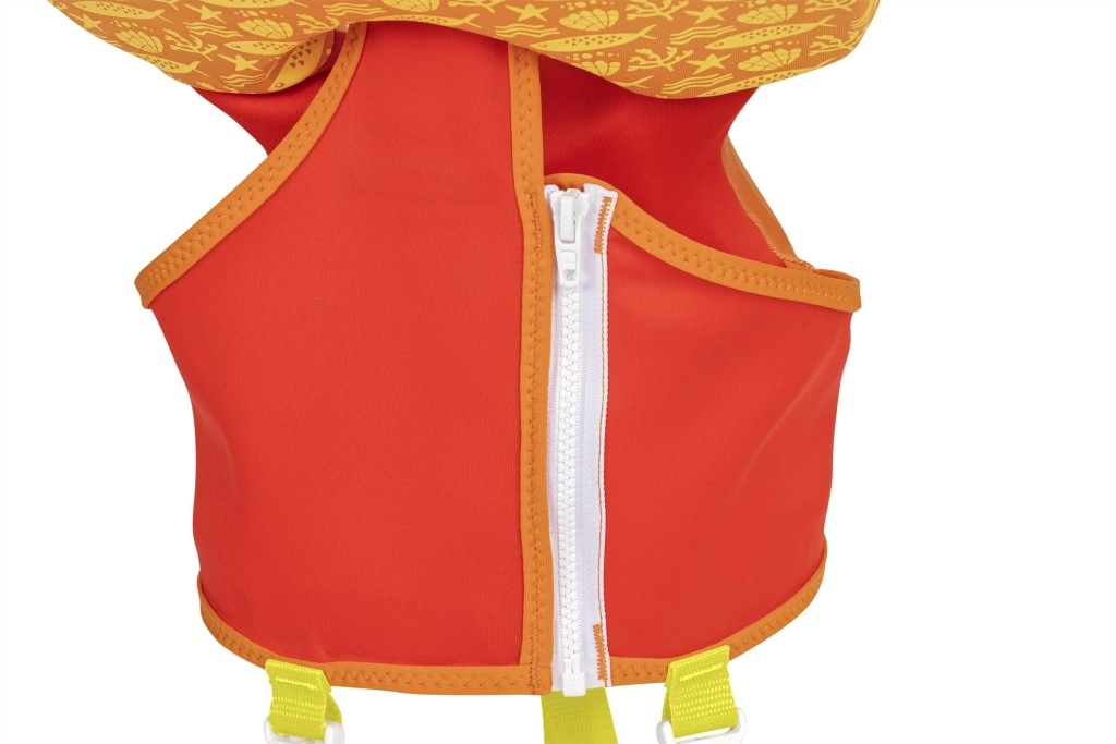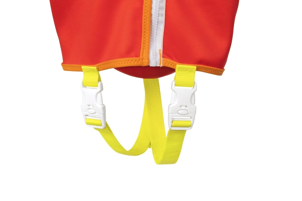 A nagy fejtámasz segít a gyermek fejét a vízfelszín felett tartani, az állítható pántok gyorscsatokkal és a lábközti pánt pedig stabil, biztonságos illeszkedést ad. A praktikus hátsó fogantyú megkönnyíti a gyermek megtartását vagy gyors kiemelését a vízből.
